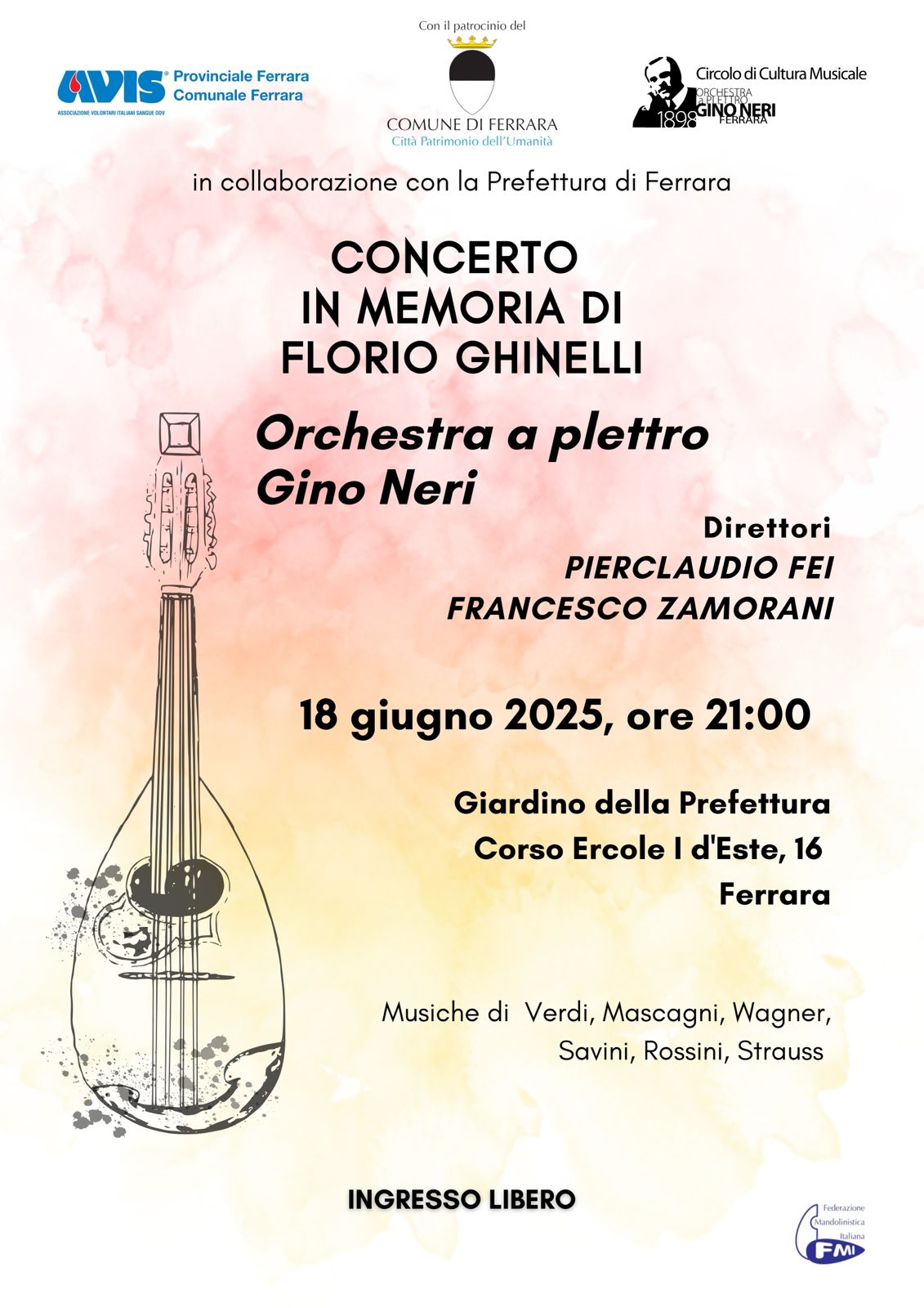 A Ferrara il ricordo in musica di Florio Ghinelli con l’orchestra Gino Neri e Avis nel giardino della Prefettura.Ferrara rende omaggio a Florio Ghinelli, personalità che ha dato lustro al tessuto associazionistico e culturale della città. A due anni e mezzo dalla sua scomparsa, la città ricorda il Professore, già primario di Infettivologia dell’ospedale Sant’Anna, direttore sanitario e presidente di Avis Provinciale, nonché pioniere nella ricerca sul plasma iperimmune. Ghinelli fu anche presidente dell’orchestra “Gino Neri” di Ferrara.